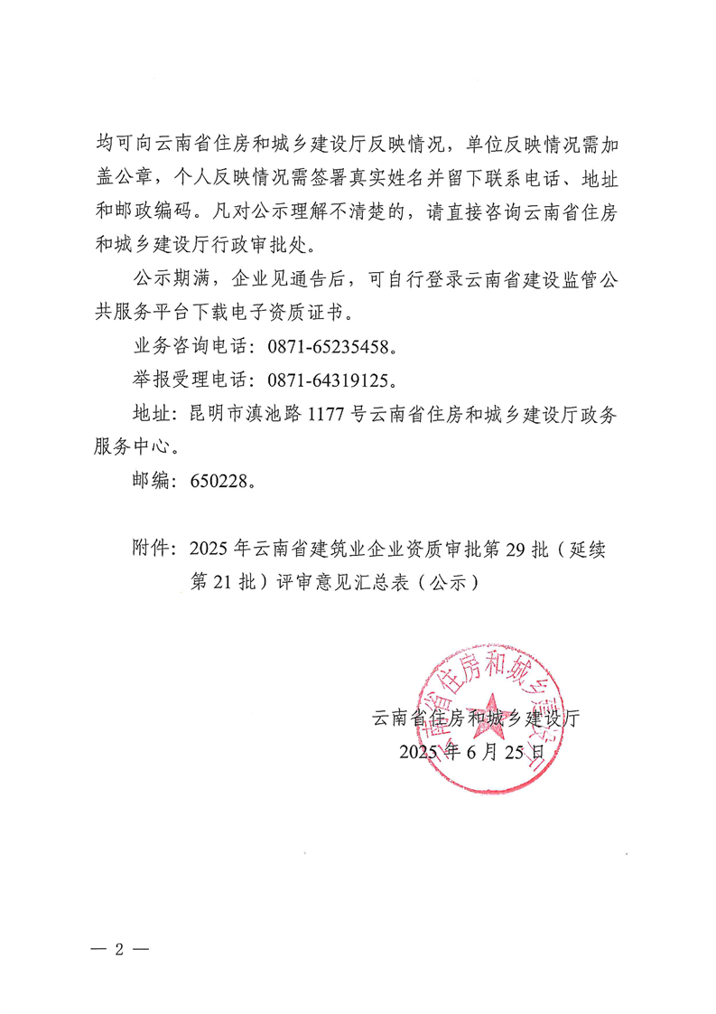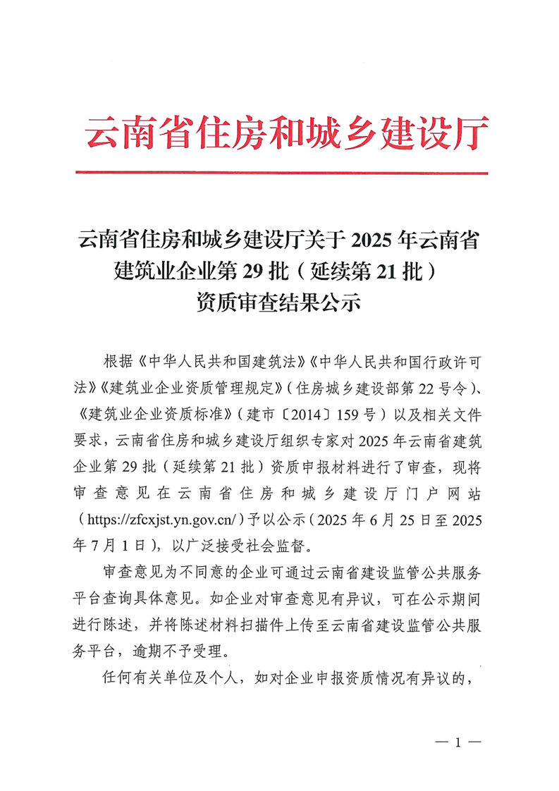 云南省住房和城乡建设厅关于2025年云南省建筑业企业第29批(延续第21批)资质审查结果公示