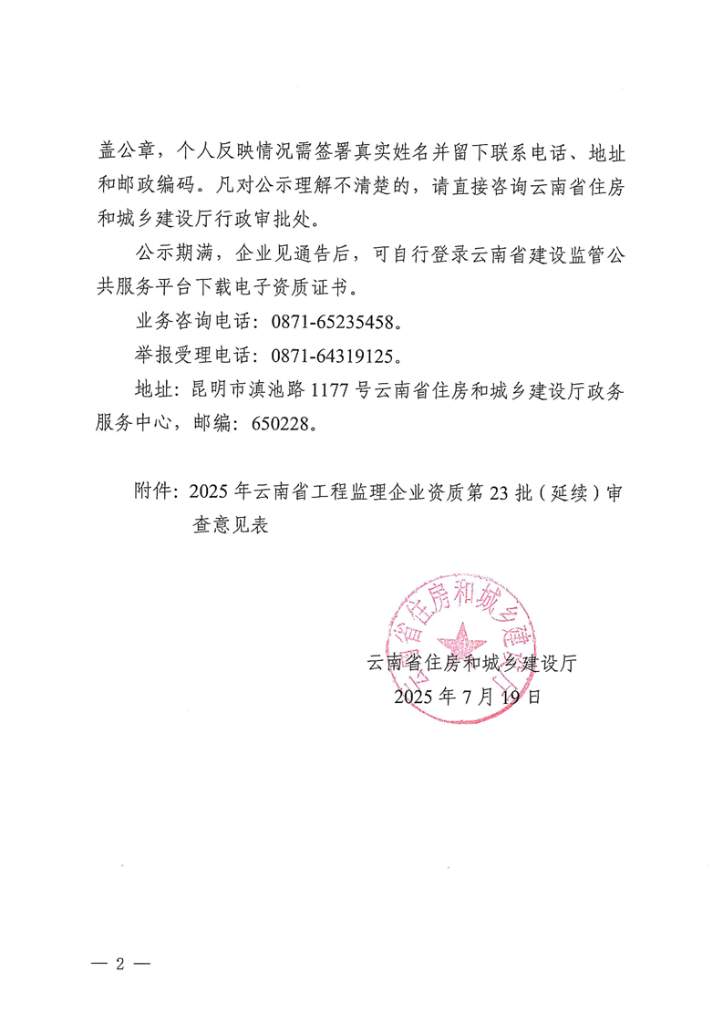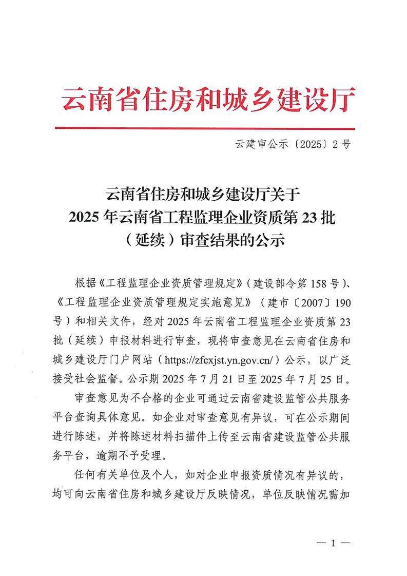 云南省住房和城乡建设厅关于2025年云南省工程监理企业资质第23批(延续)审查结果的公示