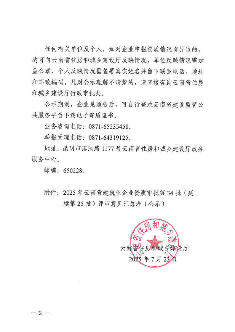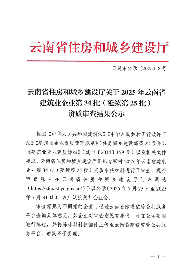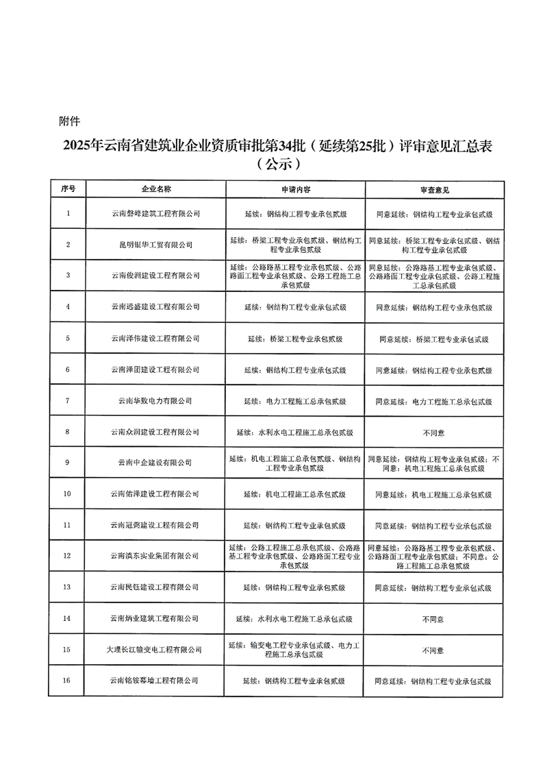 云南省住房和城乡建设厅关于2025年云南省建筑业企业第34批(延续第25批) 资质审查结果公示