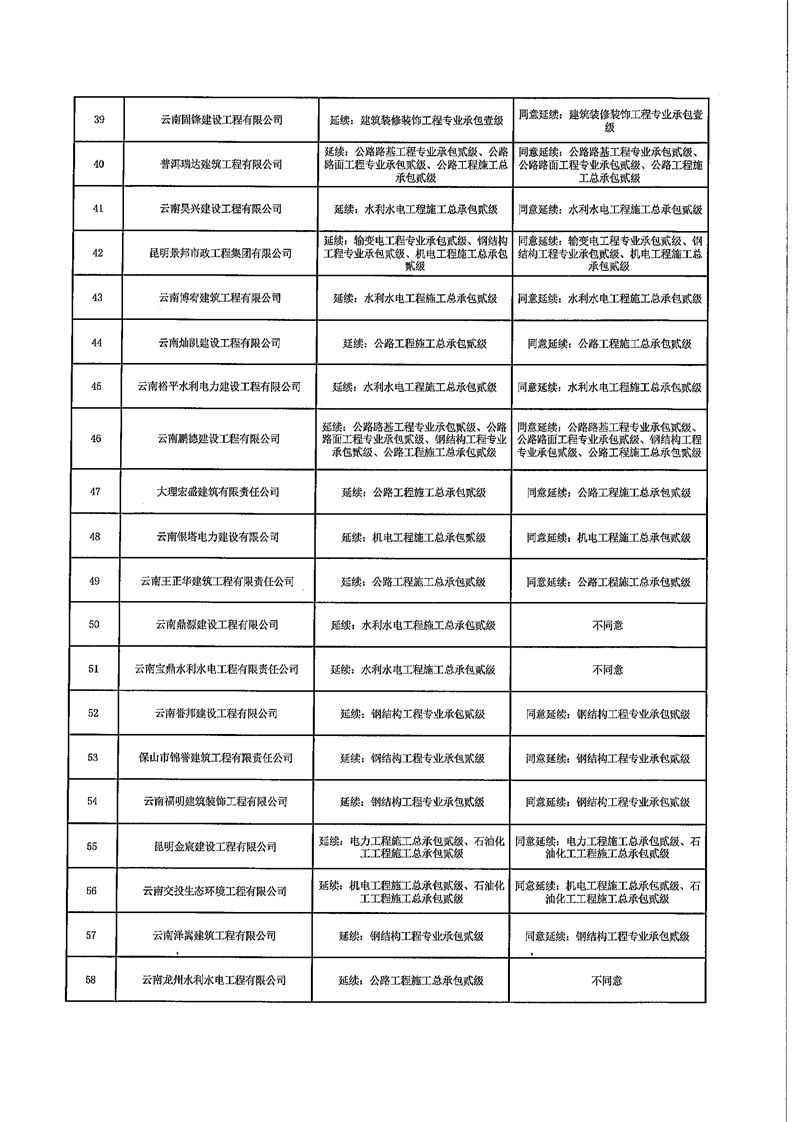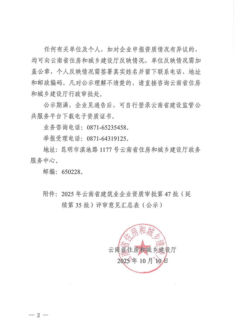 云南省住房和城乡建设厅关于2025年云南省建筑业企业第47批(延续第35批)资质审查结果公示