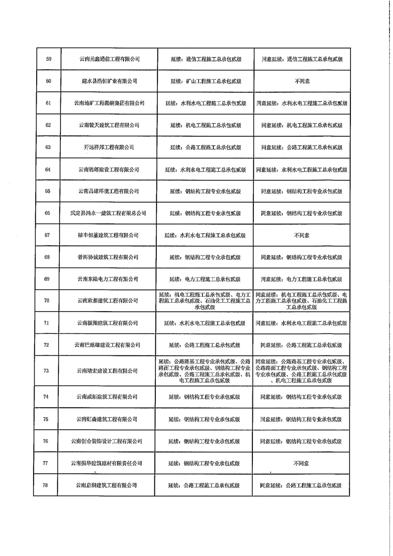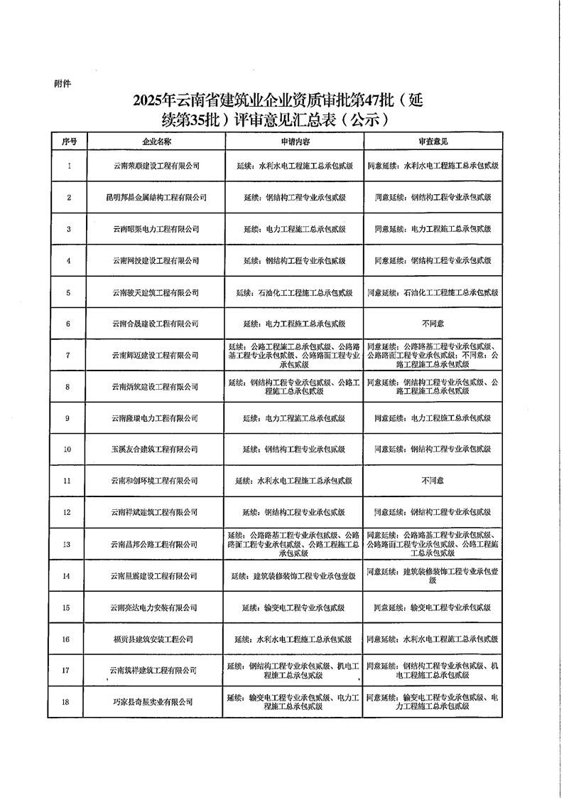 公文名称: 云南省住房和城乡建设厅关于2025年云南省建筑业企业第47批(延续第35批)资质审查结果公示