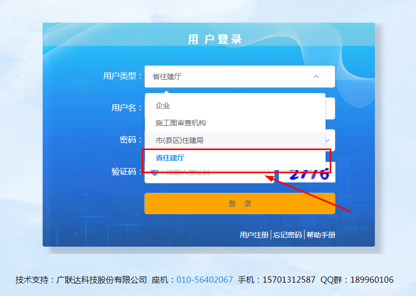 省住建厅用户由系统初始化设置时配置提供。在登录页面中选择用户类型“省住建厅”,输入用户名、密码、验证码后点击“登录”按钮,进入系统。如图1-5-1所示: