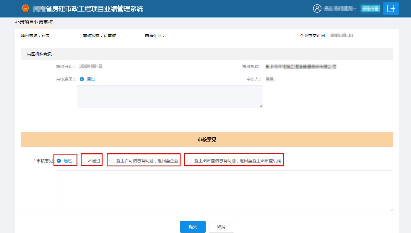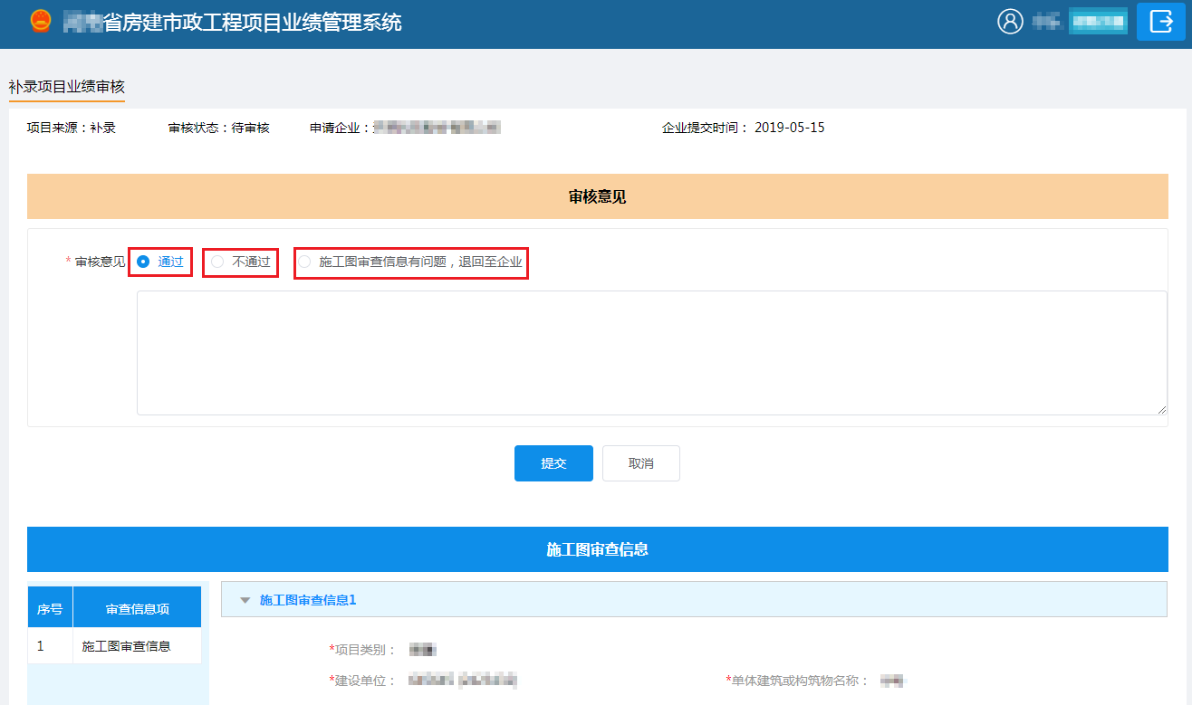 该模块显示为企业提交后经施工图审查机构确认后、住建局还未审核的项目业绩。点击“审核”跳转到审核的操作页面,审核意见分为四种“通过”“不通过”“施工许可信息有问题,退回至企业”“施工图审查信息有问题,退回至施工图审查机构”。如图2-2-4所示: