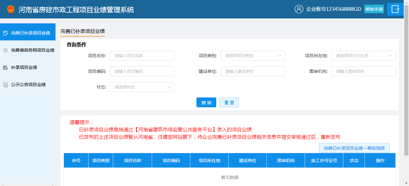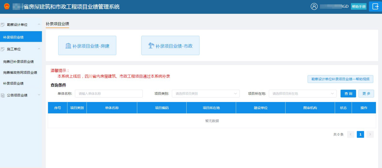 项目业绩按照房建、市政分类补录。以新补录房建项目业绩为例进行业绩完善及补录说明。