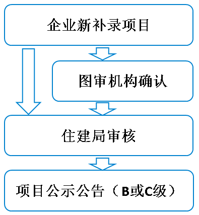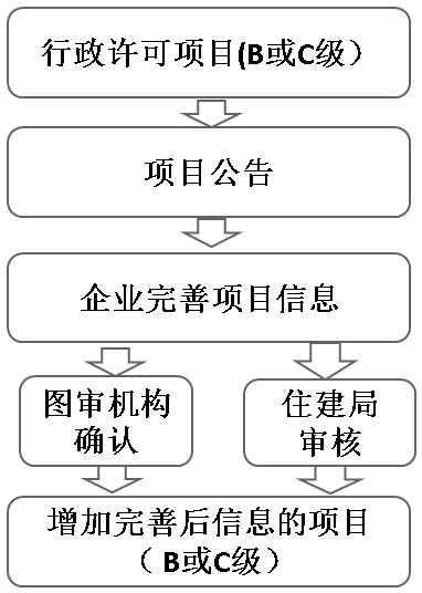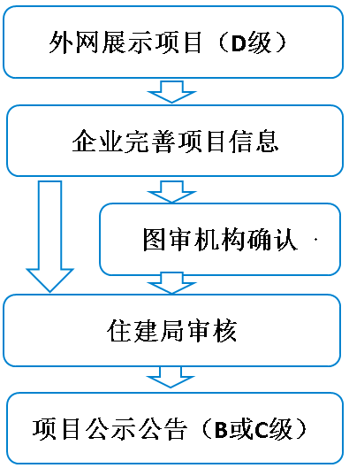 对于房屋建筑项目信息,相关企业通过省公共服务平台登录“工程项目管理系统”,在补充完整项目信息并上传企业诚信承诺书(见附件1)后,先提交至施工图审查机构对指标进行确认,再由项目所在住房城乡建设主管部门对项目真实性进行审核。审核通过的业绩按照审核部门层级自动划分为A/B/C级,未审核通过的业绩将不能入库。