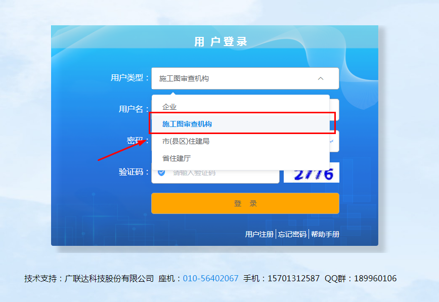 “工程项目管理系统”包括企业用户、施工图审查机构用户、市(县、区)住建局用户、省住建厅用户。四类用户使用统一的登录入口,输入用户名、密码、验证码,点击“登录”按钮进入系统。