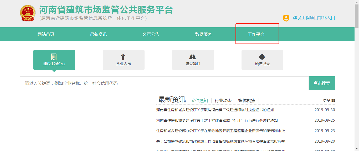 登录河南省建筑市场监管公共服务平台(http://hngcjs.hnjs.gov.cn),点击导航栏“工作平台”,找到“工程项目业绩管理系统”,点击进入河南省房建市政工程项目业绩管理系统。