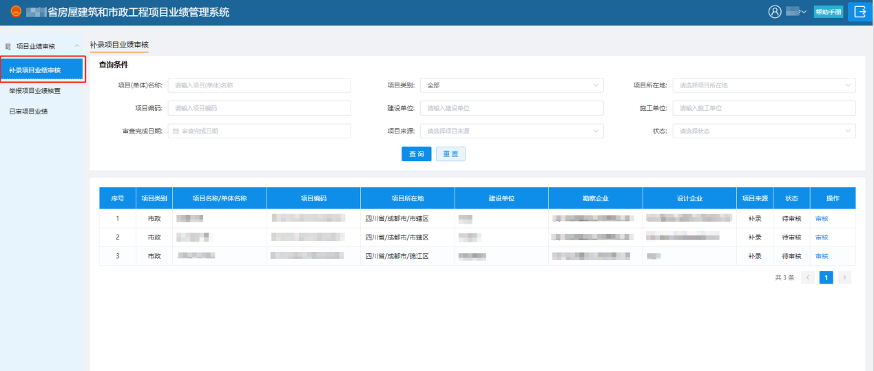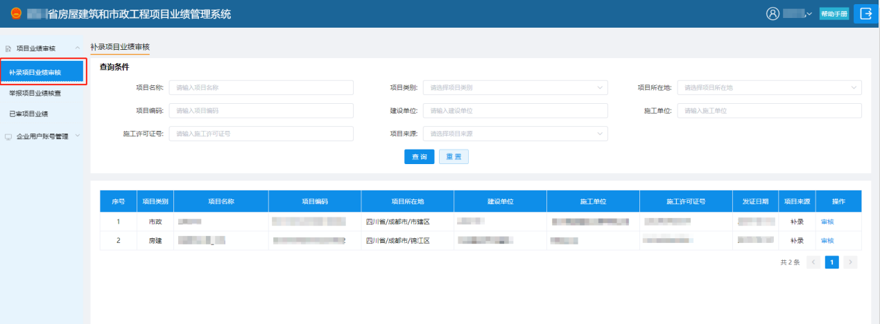 市(县区)住建局登录系统后,可在左侧导航栏看到“补录项目业绩审核”。如图2-2-3所示: