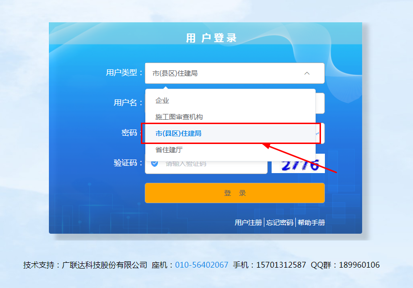 市(县区)住建局用户账号分为最大权限账号和审核权限账号。市(县区)住建局最大权限账号由省住建厅用户直接分配获得,审核权限账号由市(县区)住建局最大权限账号分配获得。在登录页面中选择用户类型“市(县区)住建局”,输入用户名、密码、验证码后点击“登录”按钮,进入系统。如图1-4-1所示: