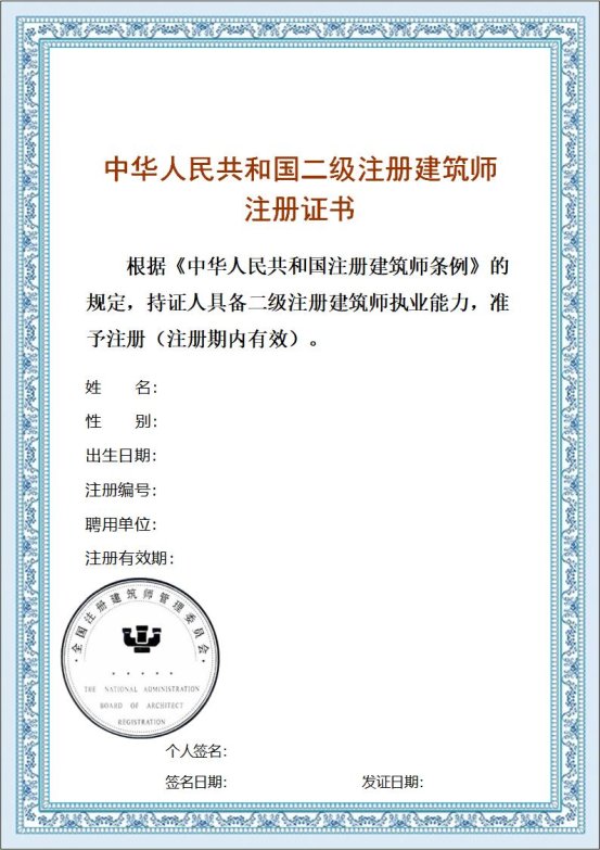 《二级注册建筑师注册证书》样式