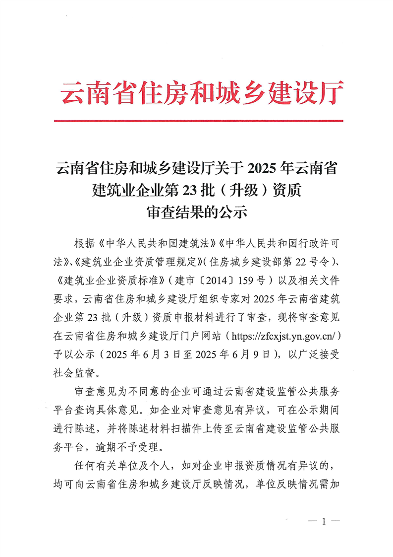 云南省住房和城乡建设厅关于2025年云南省建筑业企业第23批(升级)资质审查结果的公示