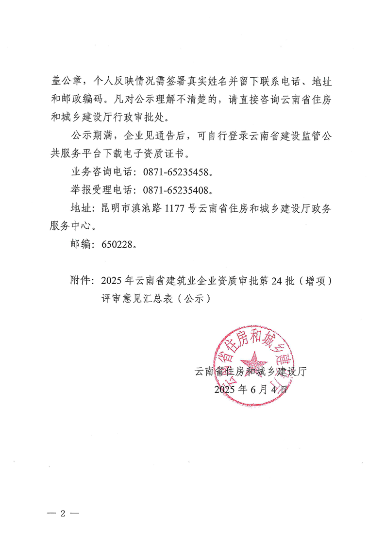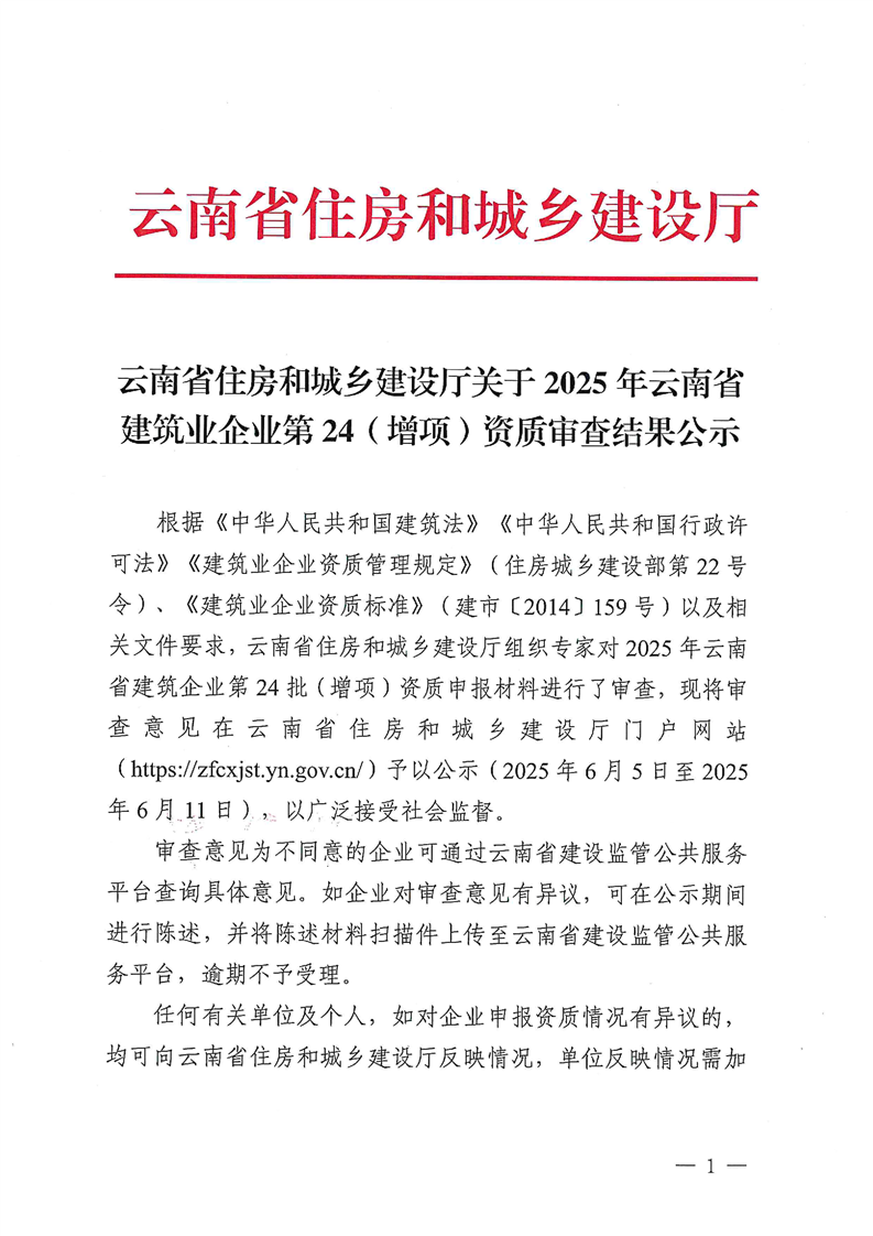 云南省住房和城乡建设厅关于2025年云南省建筑业企业第24(增项)资质审查结果公示
