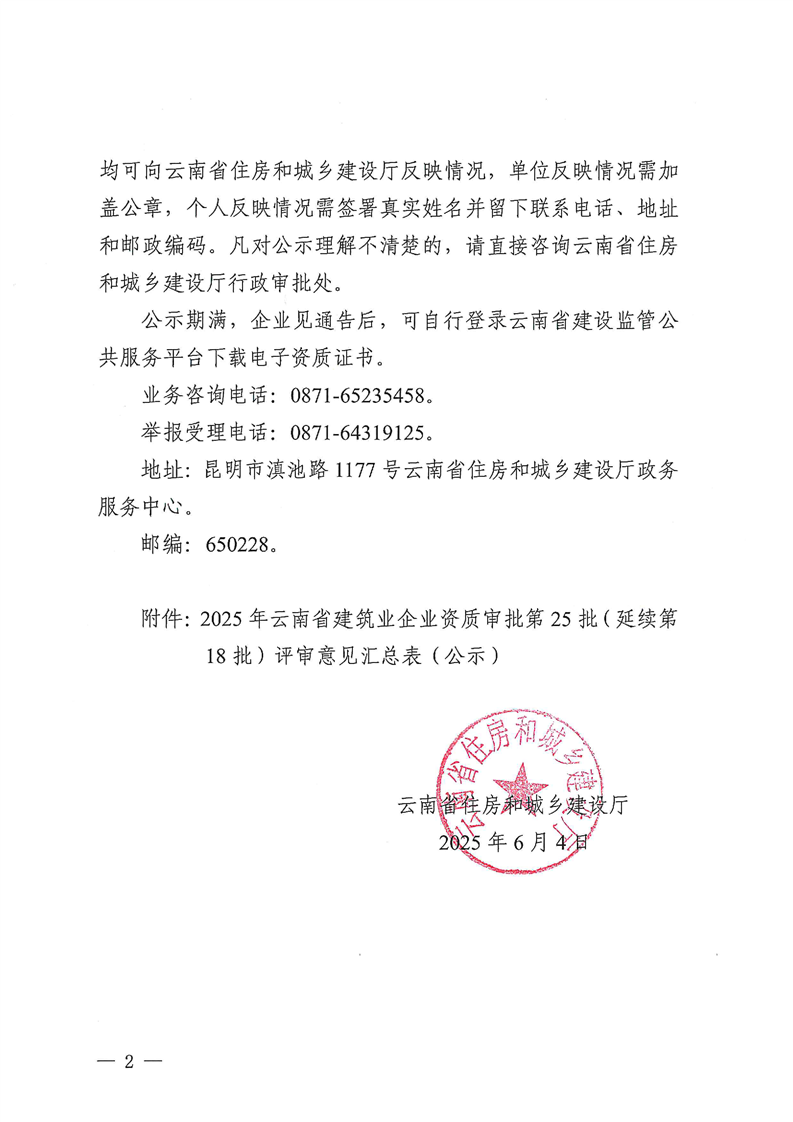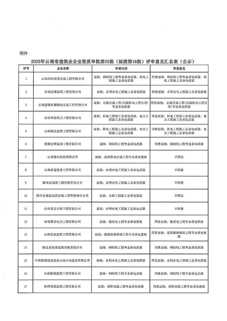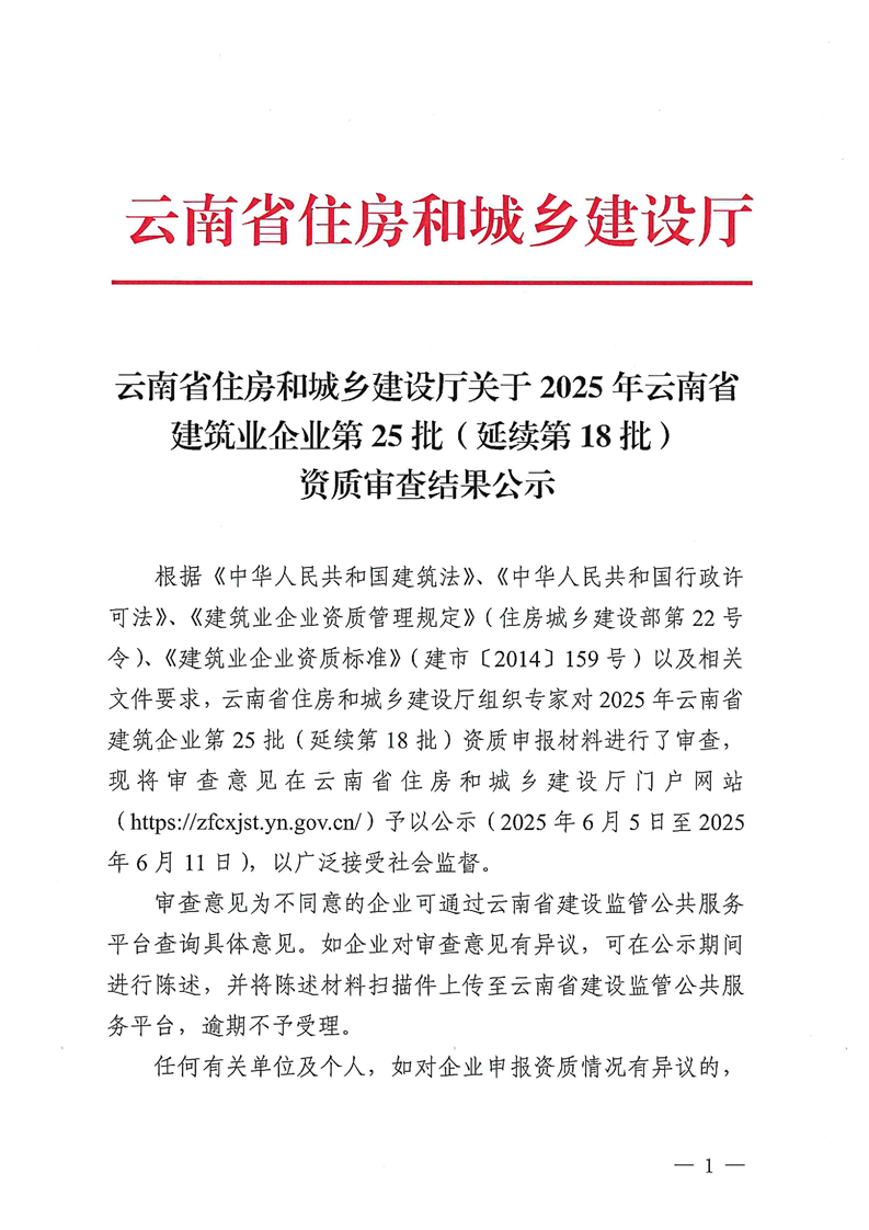云南省住房和城乡建设厅关于2025年云南省建筑业企业第25批(延续第18批)资质审查结果公示