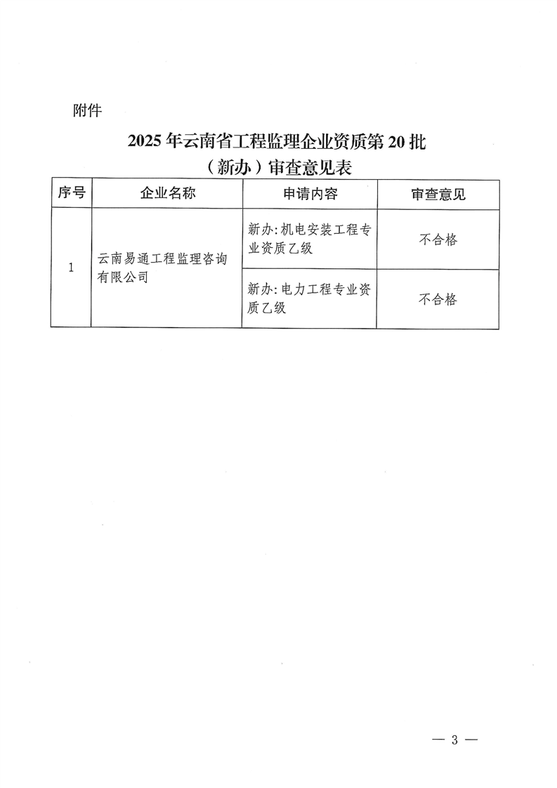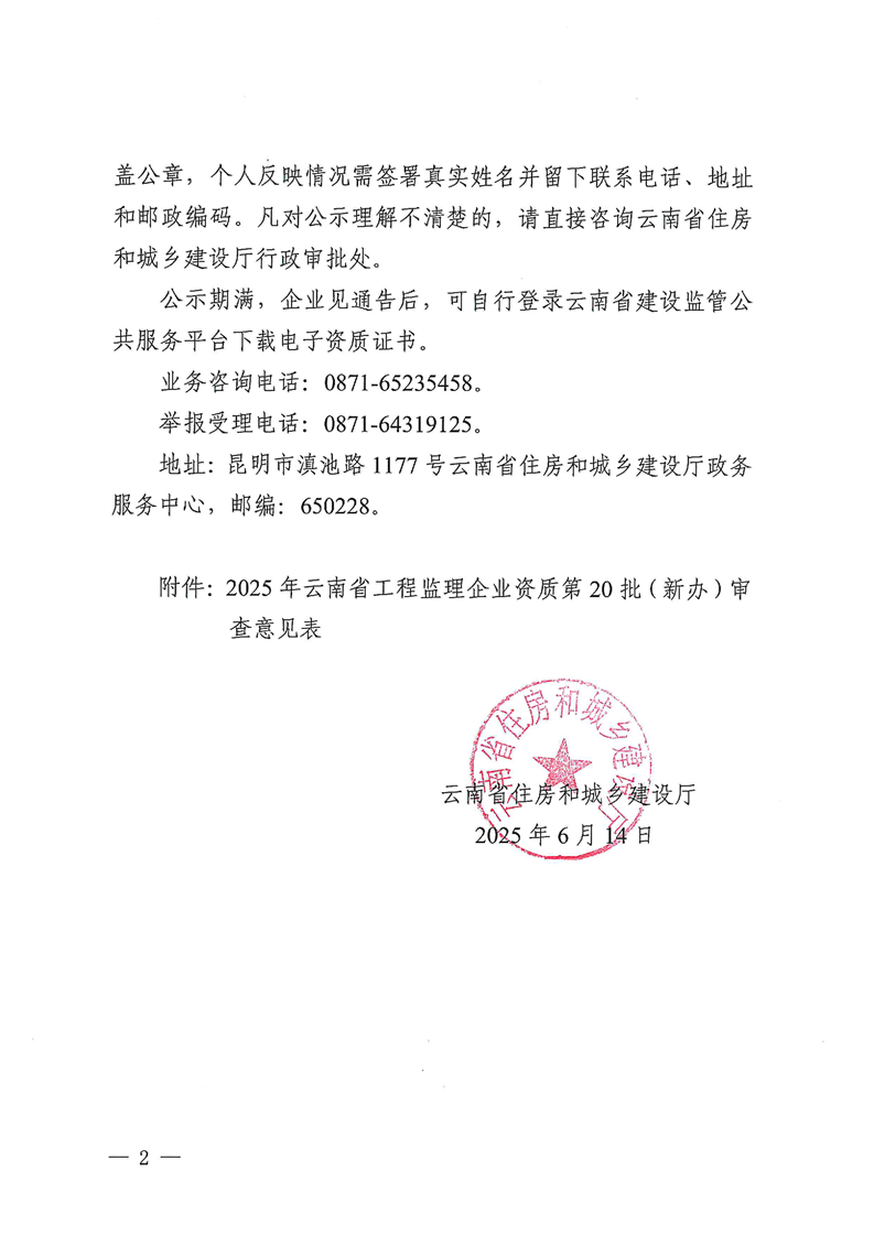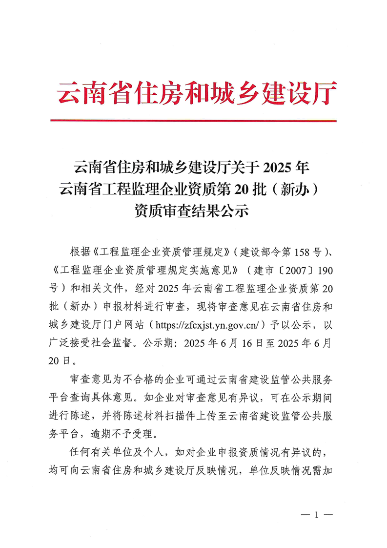 云南省住房和城乡建设厅关于2025年云南省工程监理企业资质第20批(新办)资质审查结果公示