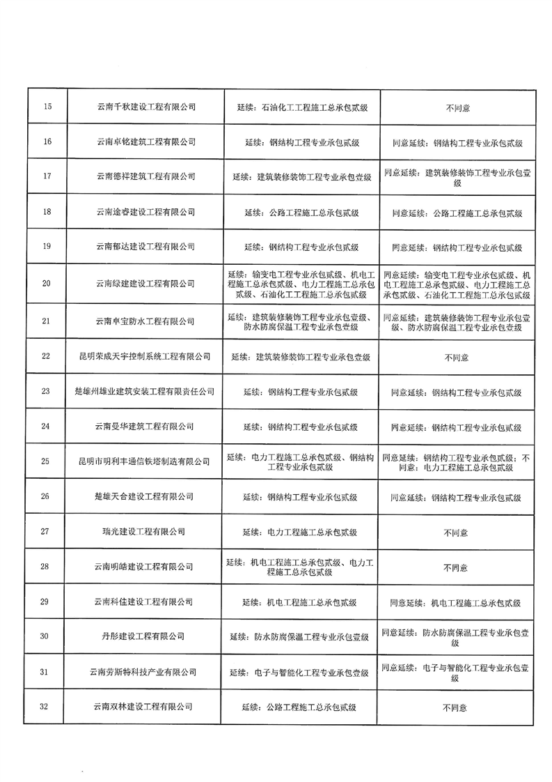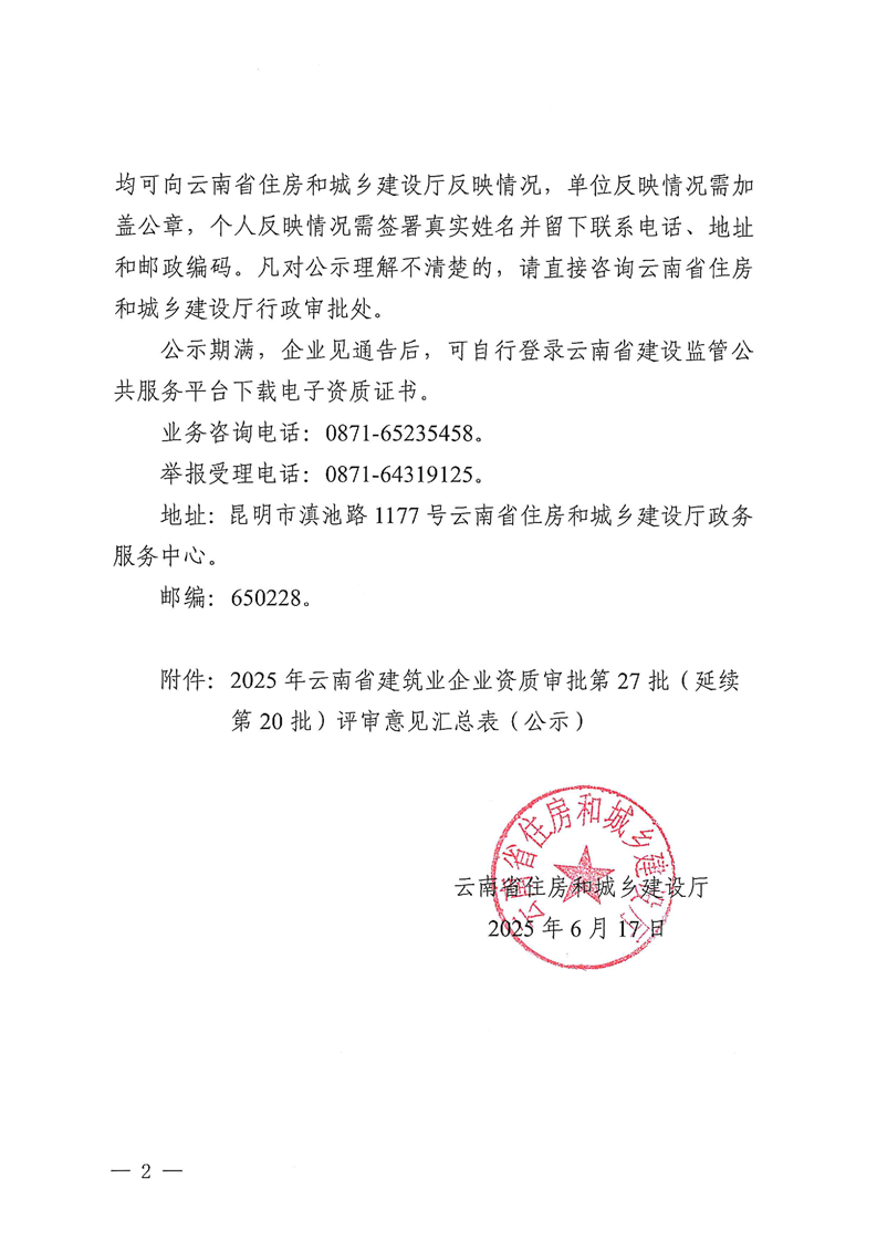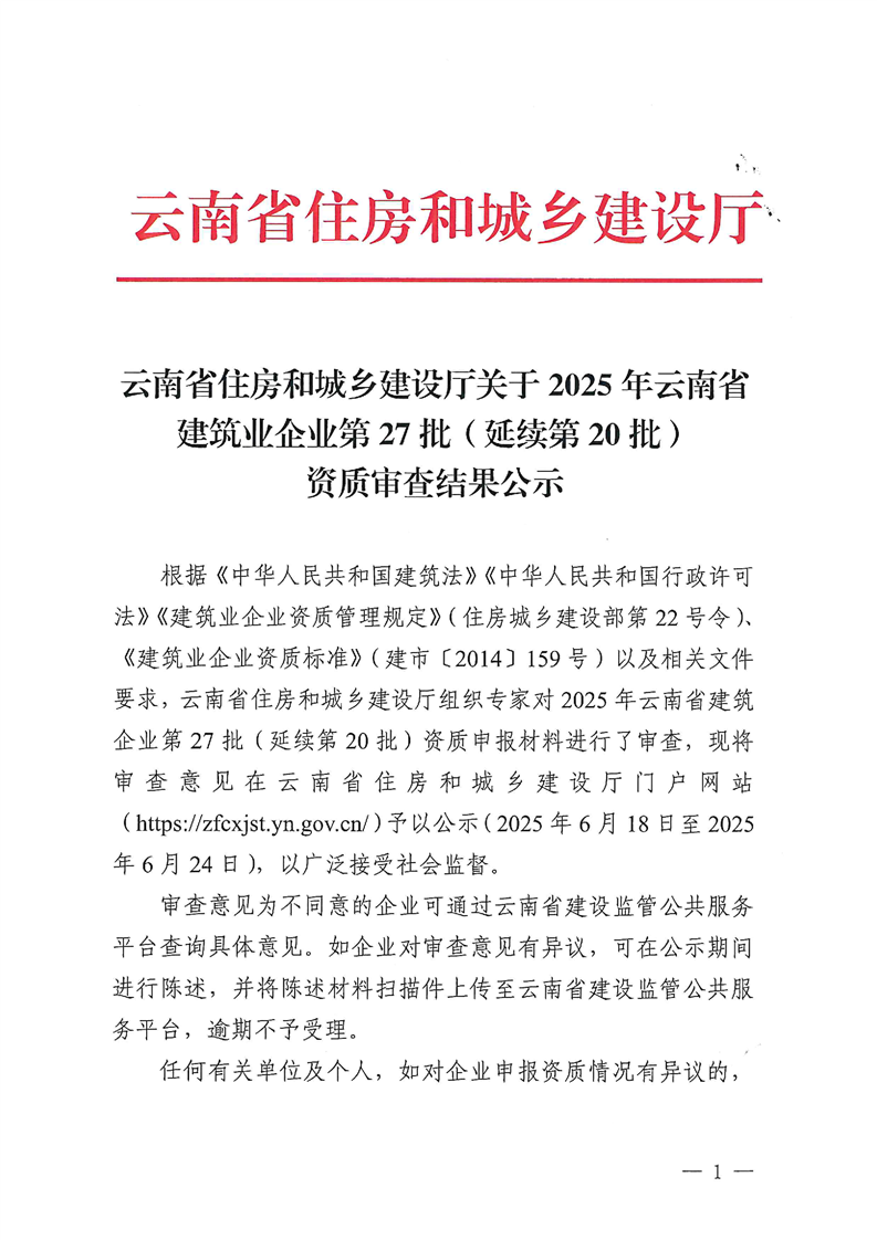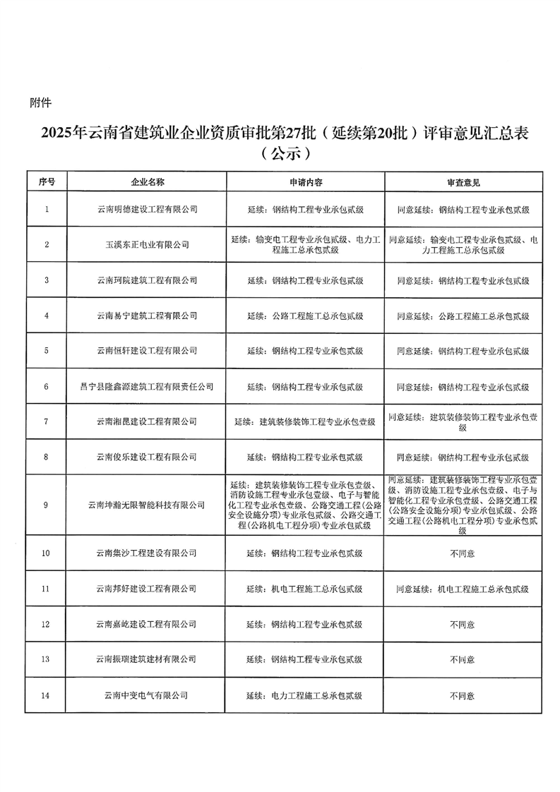 云南省住房和城乡建设厅关于2025年云南省建筑业企业第27批(延续第20批) 资质审查结果公示