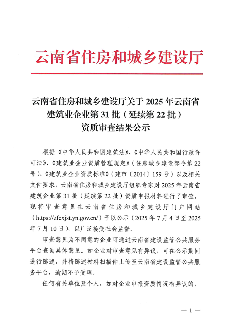 云南省住房和城乡建设厅关于2025年云南省建筑业企业第31批(延续第22批)资质审查结果公示