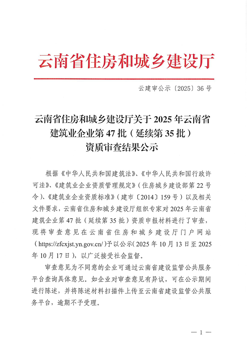公文名称: 云南省住房和城乡建设厅关于2025年云南省建筑业企业第47批(延续第35批)资质审查结果公示
