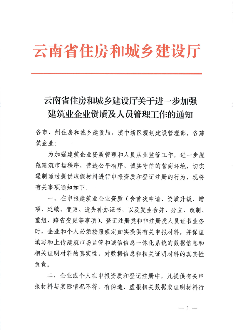 云南省住房和城乡建设厅关于进一步加强建筑业企业资质及人员管理工作的通知