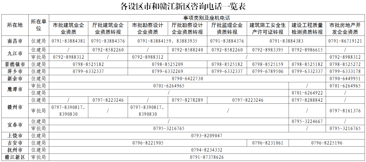 (2)各设区市行政审批咨询热线,协助省厅解答本辖区内企业关于资质审批政策具体条款、办理程序,回复市级资质审批事项有关问题以及市级12345工单。各设区市和赣江新区咨询电话详见下表:
